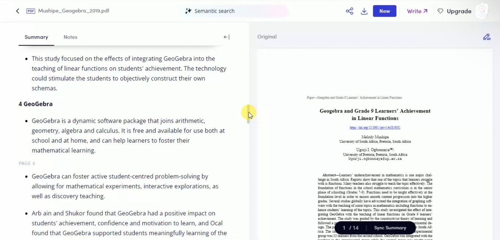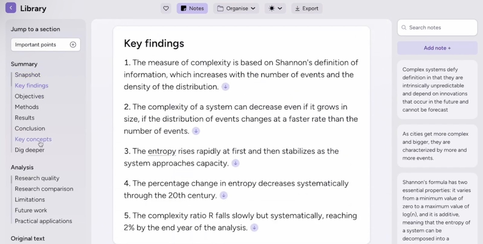 You can scroll through the original and keep the summary panel open beside it, which makes it easier to link each point back to the source.