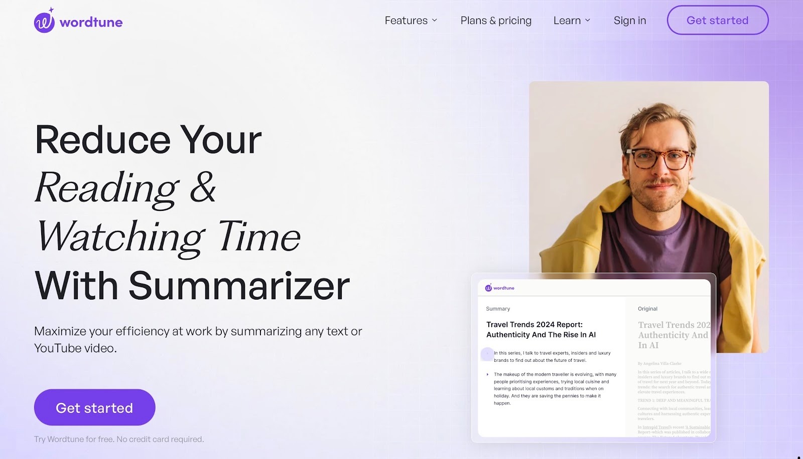 What does it do? Wordtune helps you turn long documents and videos into short, clear summaries.