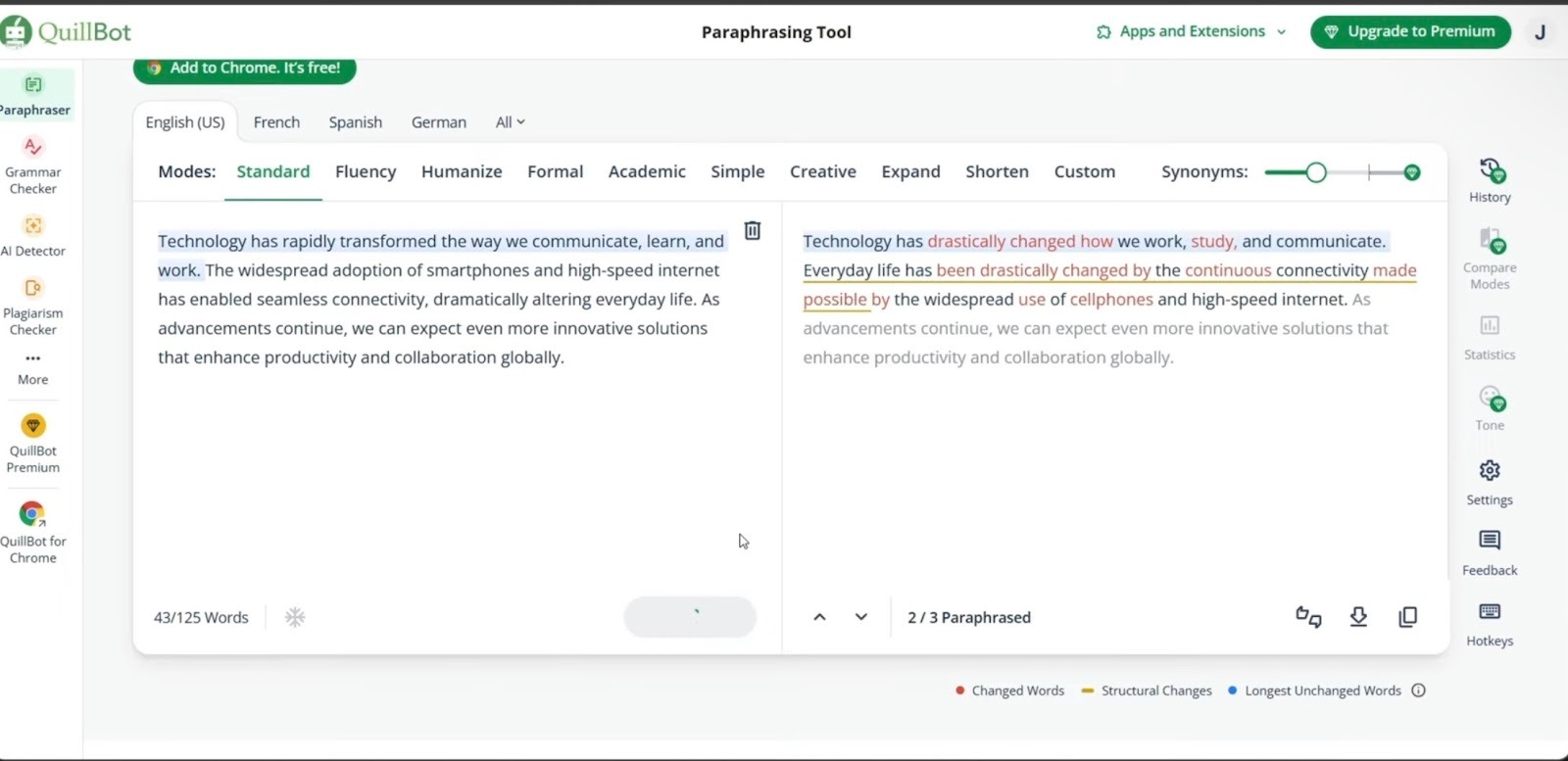 You choose a mode that fits the job. I prefer Standard for light rewording, and Formal for a cleaner, more professional text. The synonym slider lets you decide how much to change, so the output can stay close to your voice.