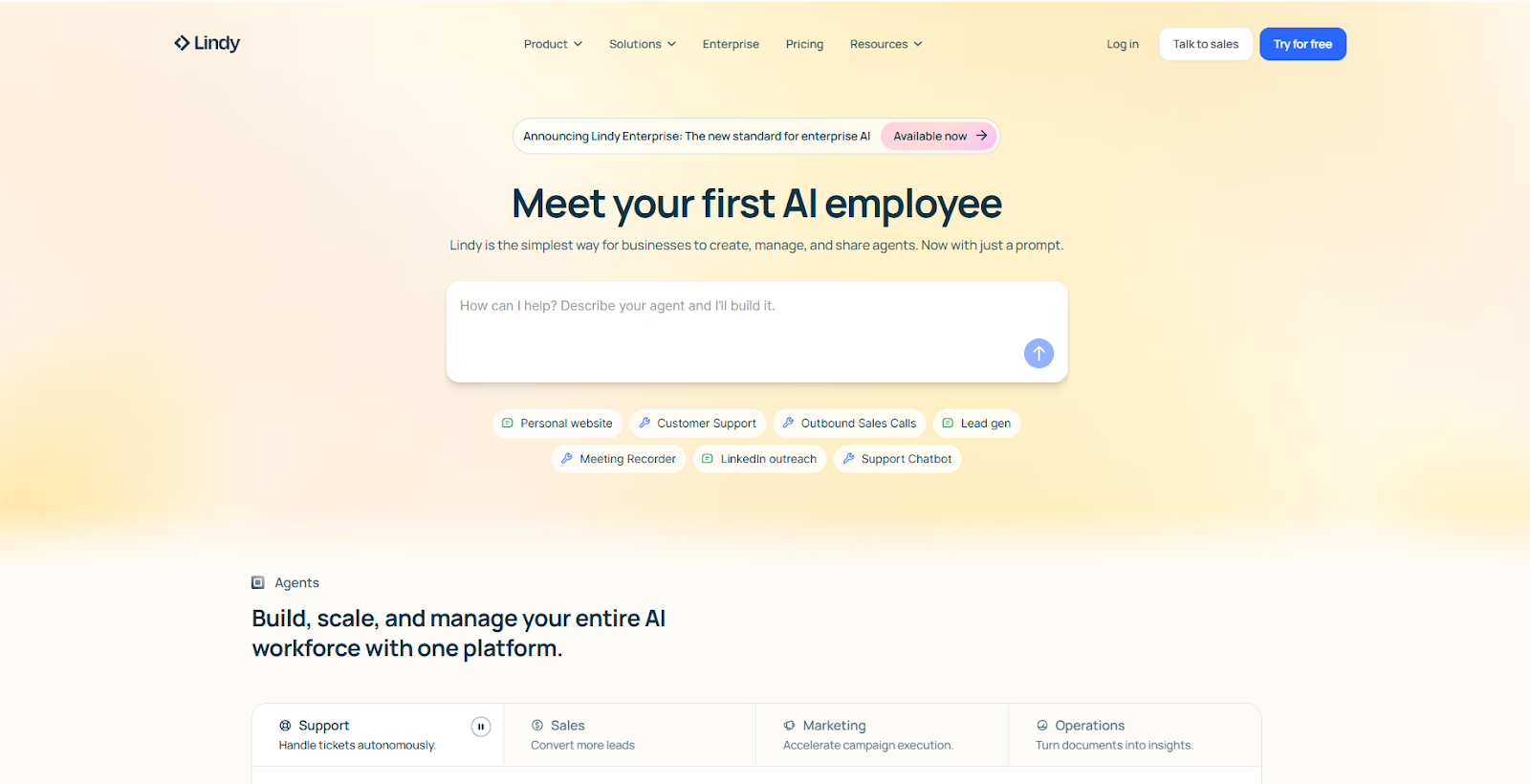 Lindy also acts as an AI workflow automation tool and lets you create custom AI agents without writing code to automate workflows like lead routing, email handling, or phone calls.