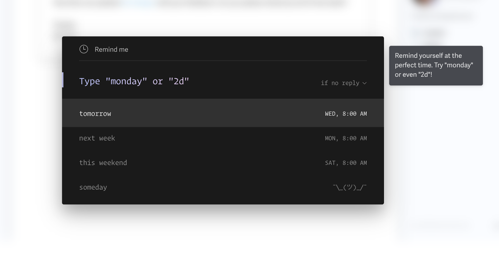 The command palette (Cmd+K or Ctrl+K) quickly became my favorite feature. It let me compose new emails, set reminders, mark messages as read, or archive threads without touching my trackpad. Commands like “Monday” or “2d” set follow-ups at the right time, and these quick actions made email management feel less heavy. After a few days, I barely used the mouse.