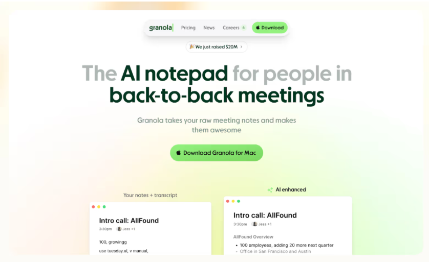 Granola focuses on clarity and control. It records and transcribes meetings straight from your Mac or iPhone, without adding a “bot” to the call.