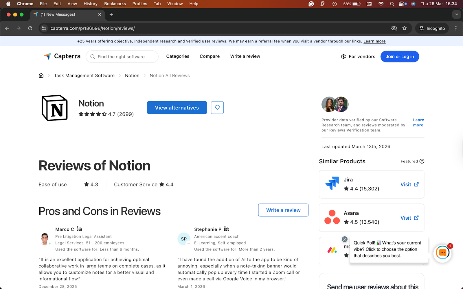 - “Notion has given me the flexibility I was looking for in my projects. I have everything I need in one place. As a digital marketer, it's very useful for team collaboration or project collaboration; you can personalize every dashboard for every client.” — Elena T, Capterra