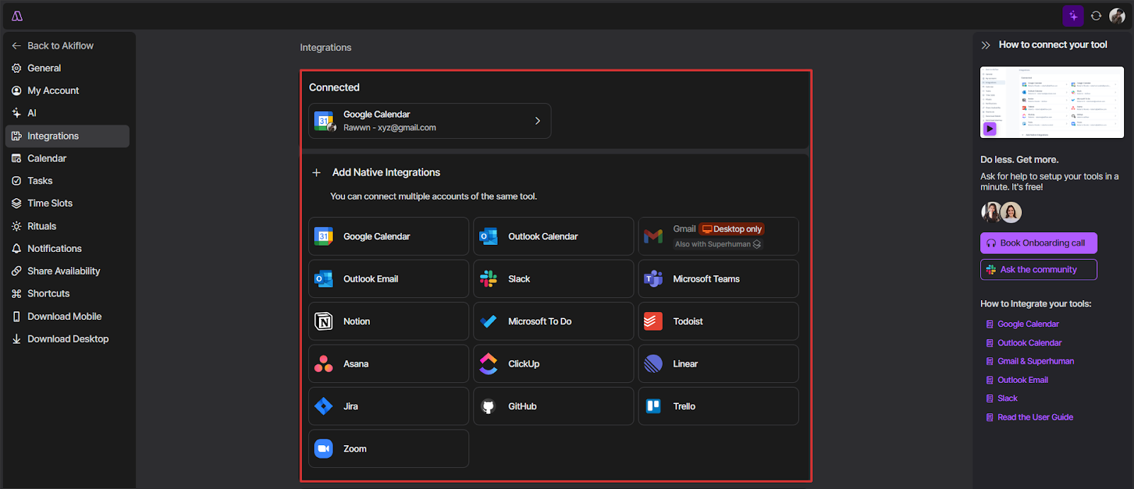 One subtle but helpful feature is the daily shutdown ritual. At the end of the day, Akiflow prompts you to review what’s done and preview what’s next. It helped me mentally close the loop instead of staying in work mode all evening.