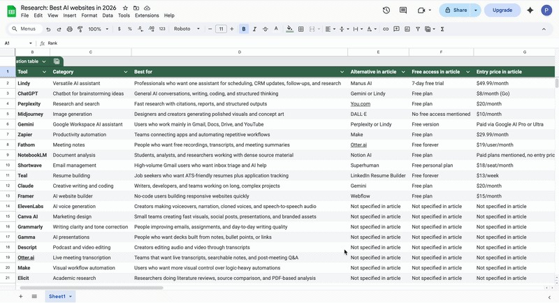 What it does: Perplexity is an AI-powered research engine that automates research, data analysis, and multi-step workflows. It runs multiple searches at once, pulls information from different sources, and turns the findings into structured reports or spreadsheets.