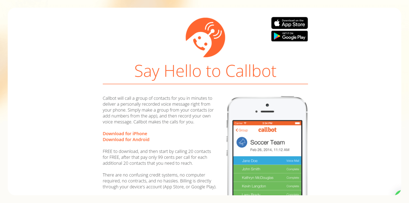 Callbot is an automated calling app to call multiple contacts when you need to call them, but don’t need to have a conversation. Notifications, reminders, and announcements are some examples of Callbot use cases. Record your message and Callbot will call your list of contacts for you.