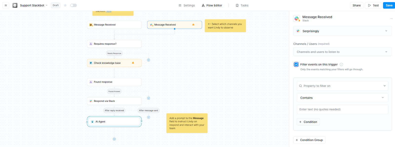 With Lindy, you don’t need to touch code. Just open our visual builder, add a few instructions, and your AI agent is ready to go. You can train it on help docs, websites, internal files, or connect it to tools like Slack, Notion, Gmail, Salesforce, or HubSpot. Lindy pulls in that knowledge and uses it to act, not just reply.