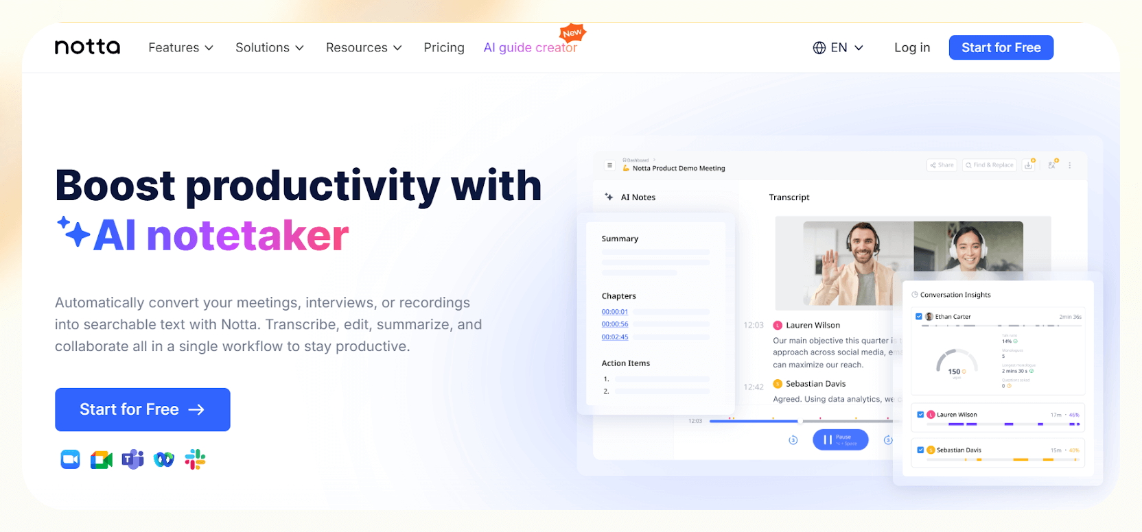 What does it do? Notta is a transcription and meeting assistant powered by AI that transcribes live audio, summarizes conversations, and translates transcripts into multiple languages.