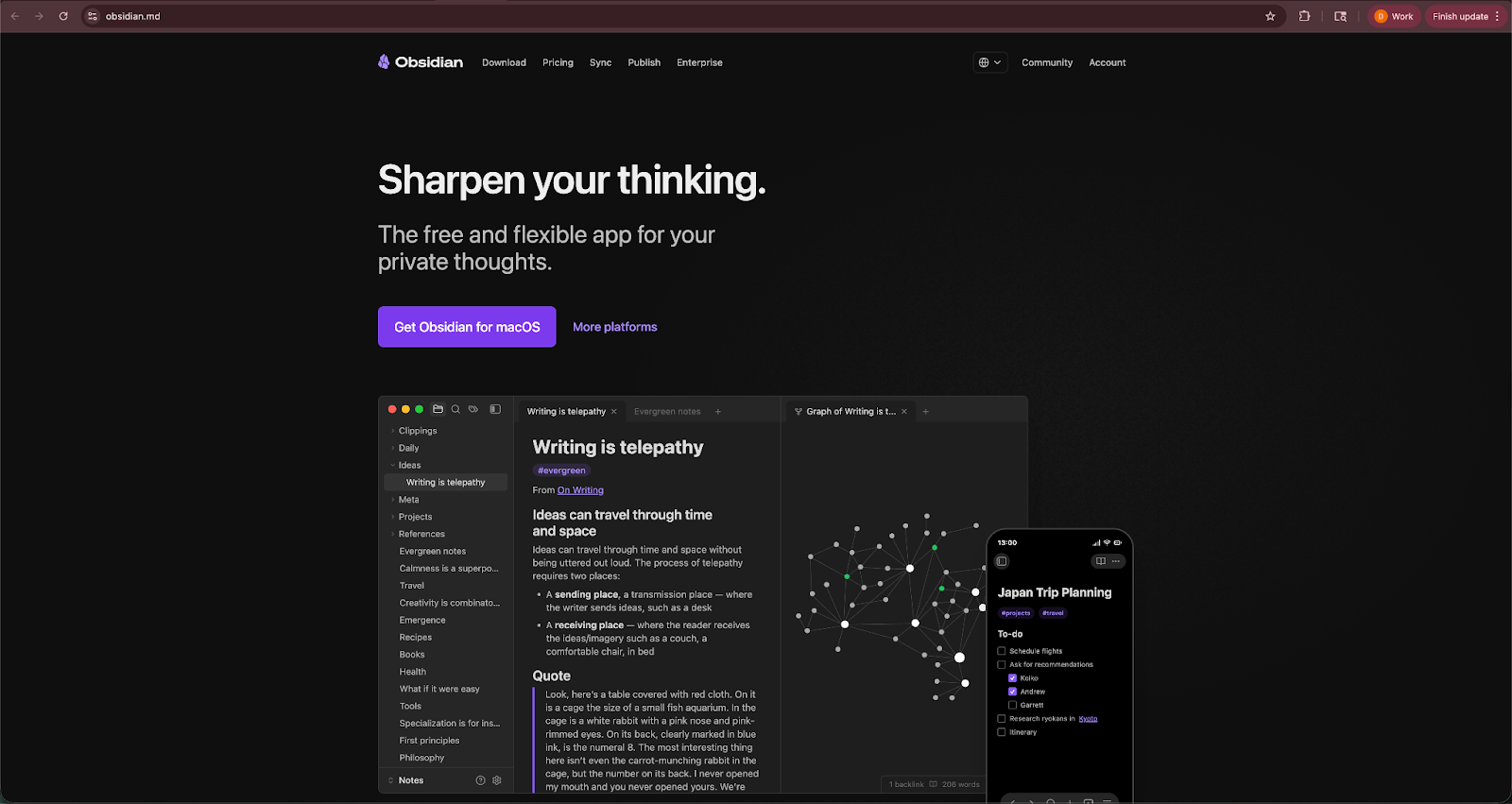 Obsidian helps organize ideas and connect information across projects. Writers, researchers, and knowledge workers often use it as a personal knowledge base.