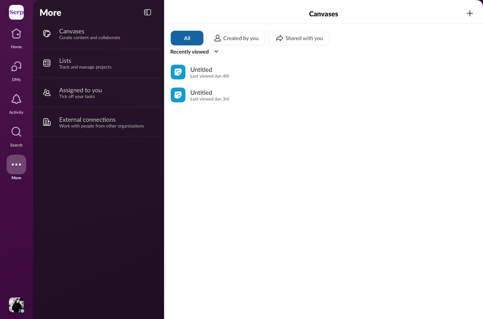 Slack also organizes information by grouping documents, bookmarks, and links into folders within each channel. Tabs make it easy to switch between messages, pins, and workflows.
