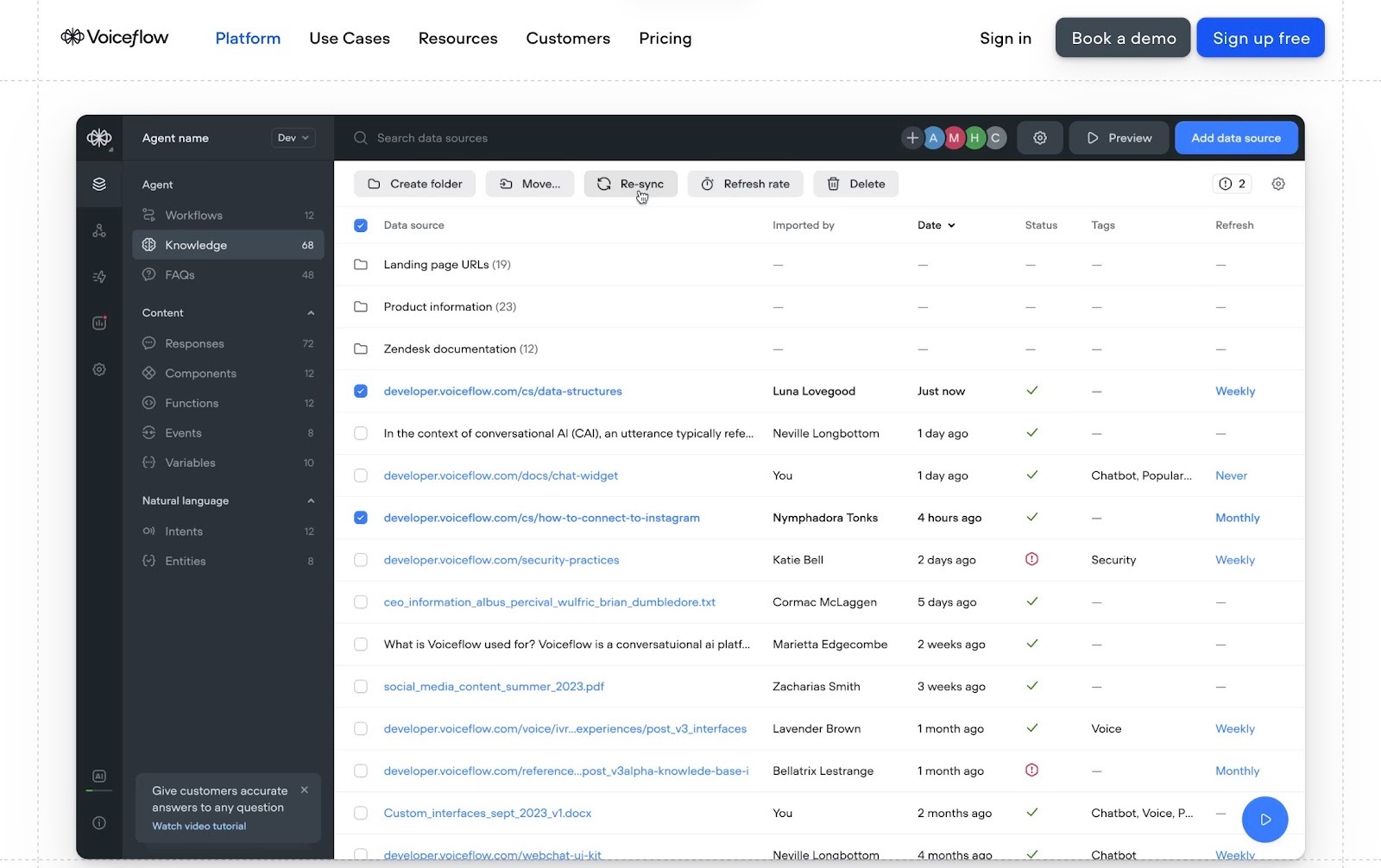 Voiceflow helps you clearly build voice and chat agents. You start by adding your content that includes FAQs, help articles, and product docs. Voiceflow turns this into a knowledge base, so agents can answer with your own information.