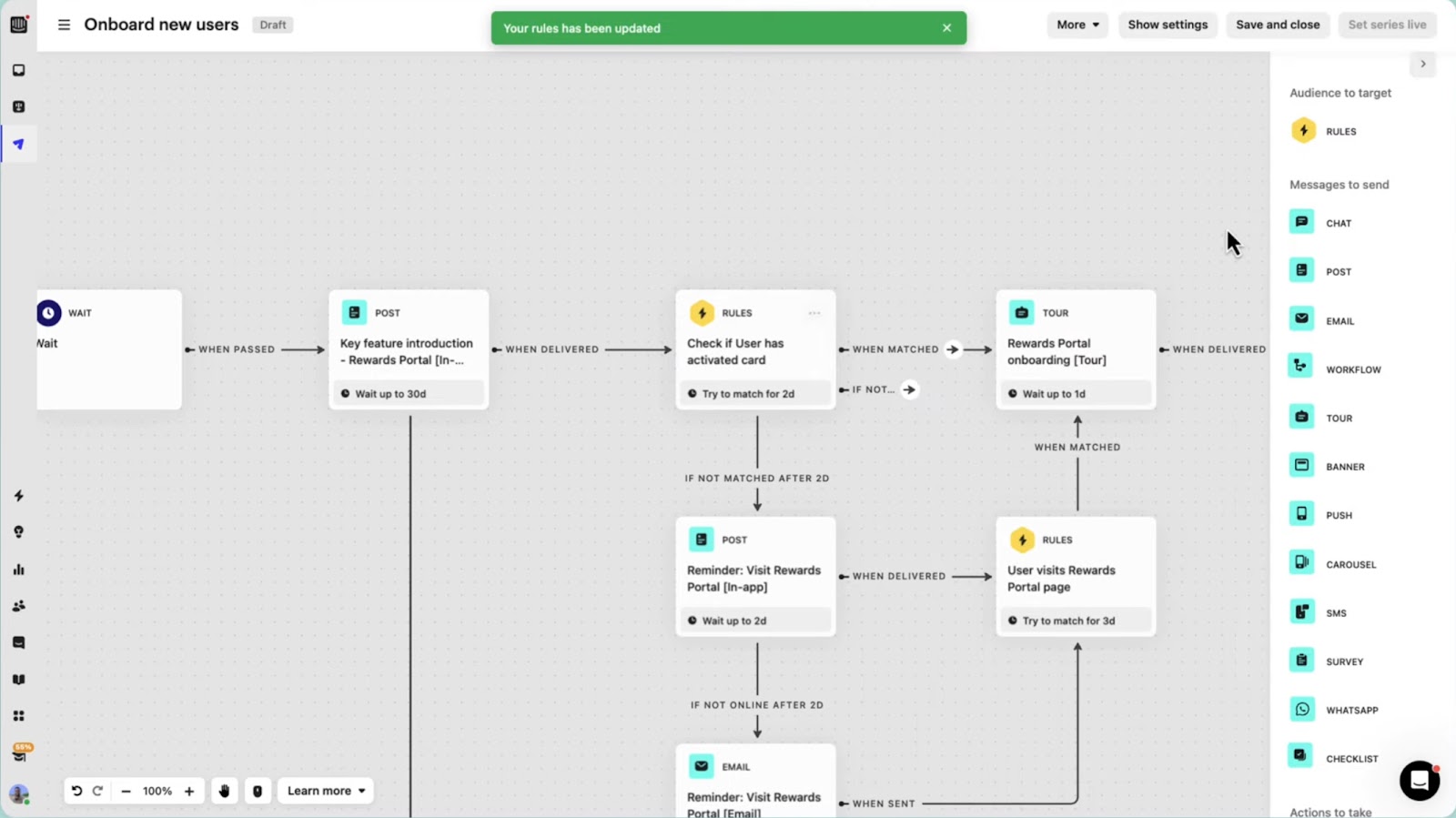 - Simulated Real Lifecycle Journeys: I started by mapping out a complete customer lifecycle from first interaction to onboarding, product milestones, renewal periods, and re-engagement efforts. I recreated typical scenarios like welcoming new users, nudging inactive accounts, and triggering check-ins before a contract ended. If a tool only handled surface-level communication, it didn’t cut.