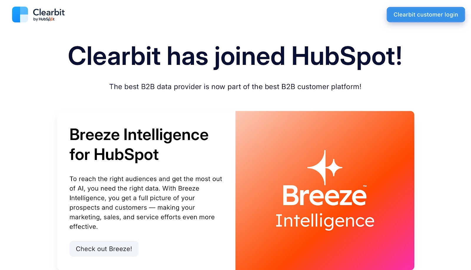 10. Clearbit (Breeze Intelligence): Best for Real-Time Lead Enrichment and Form Optimization