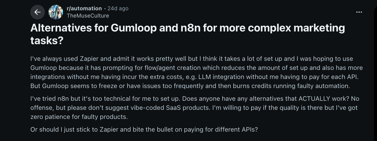 Gumloop workflows are great to begin with but are equally hard to manage as you scale and tweak your approach. If you browse Reddit or automation forums, you’ll see people saying the same thing.