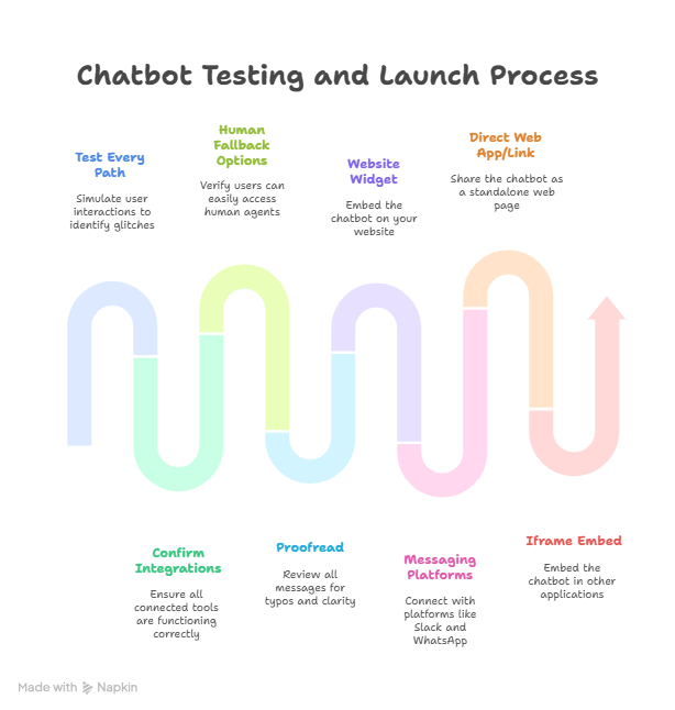 Once you're happy with how it performs, it's time to launch your chatbot. You can do it in multiple ways:
