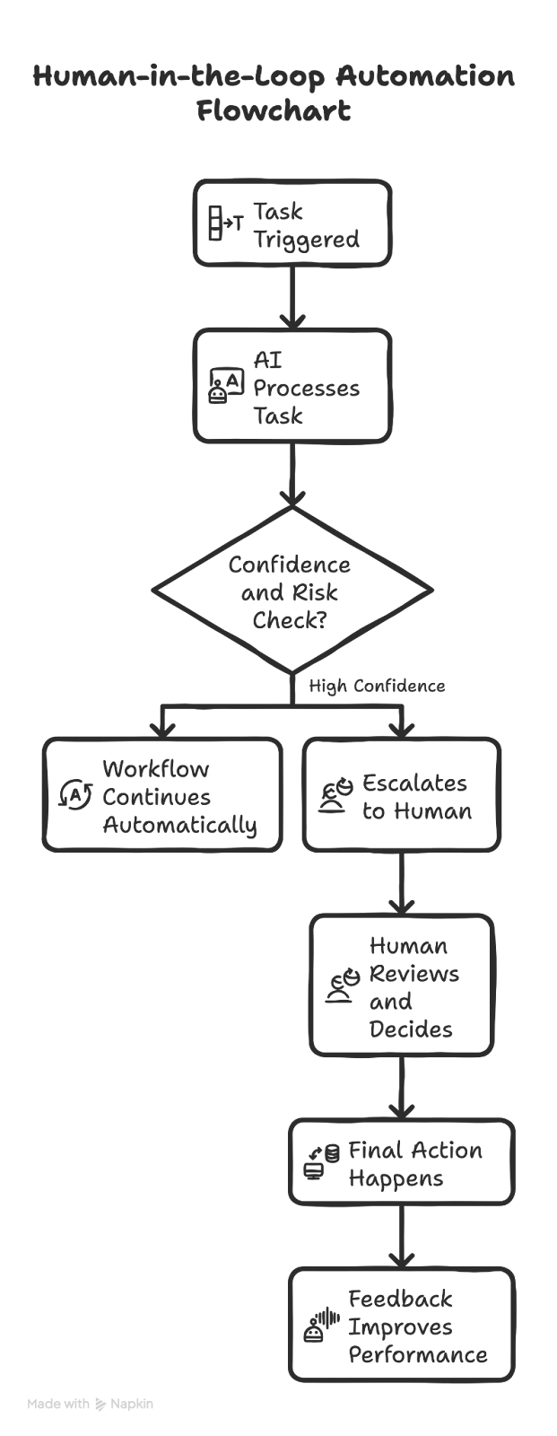 - The system checks confidence and risk: It evaluates if it’s confident enough to proceed or if it is a high-stakes decision based on thresholds, rules, or policy.