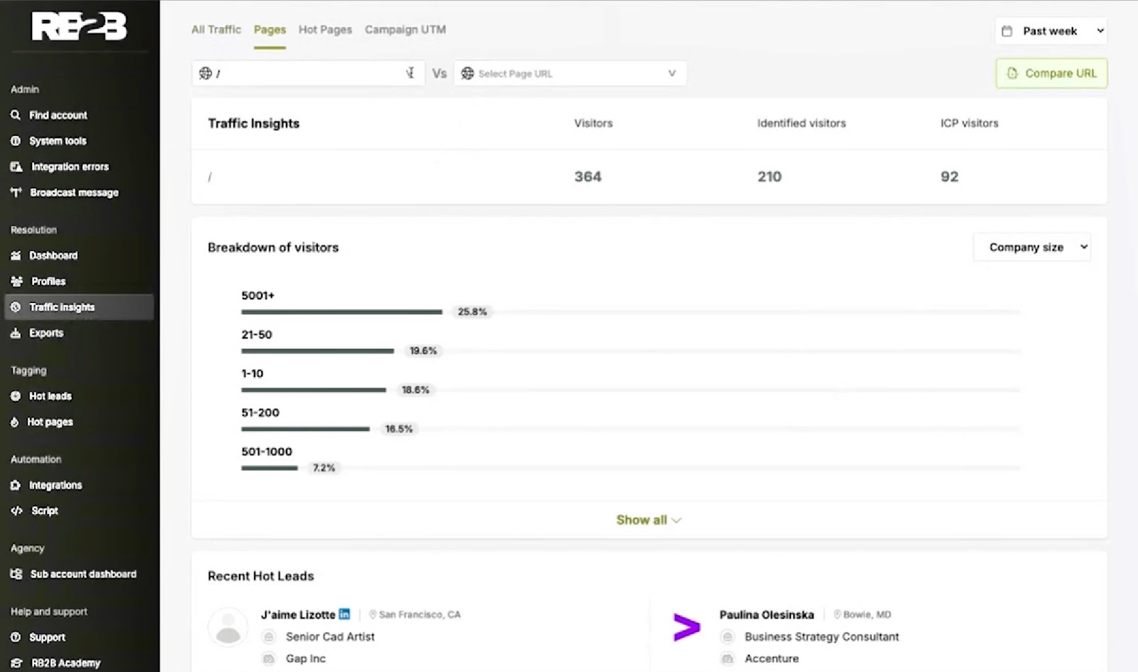With custom segmentation, you can define what a “hot lead” looks like, say, companies that viewed your pricing page twice within a week, and then have those leads flagged in real-time.
