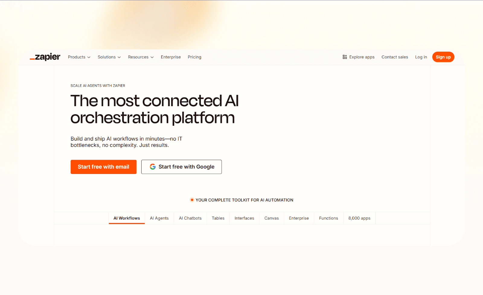 - App ecosystem: Connects to over 8,000 apps, covering nearly every major business tool.