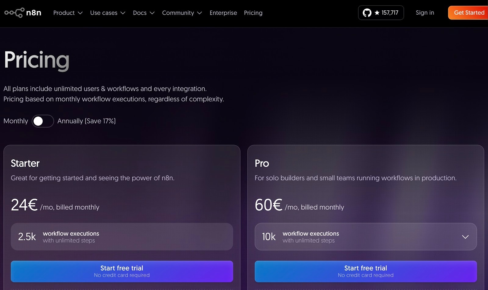 n8n’s pricing structure is built around workflow executions. On the cloud side, you can start with the Starter plan at €24/month for 2,500 workflow executions. The Business tier is €800/month for 40,000 executions in a self-hosted environment.