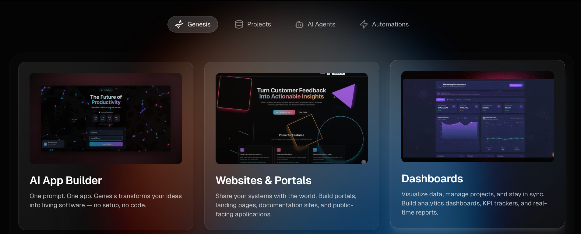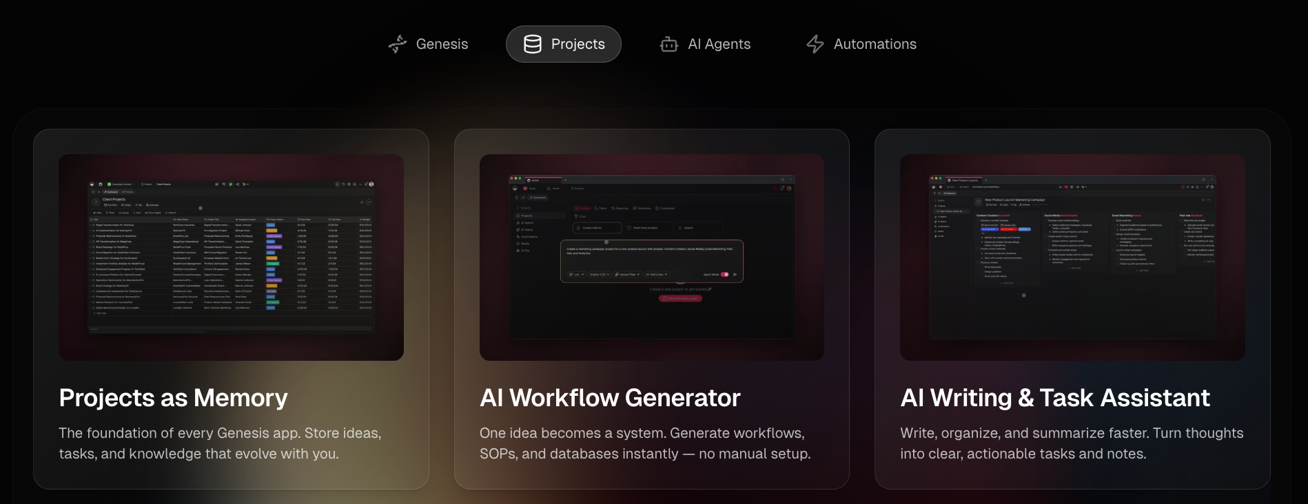 Genesis turns a short prompt into a working project setup. I tried typing “Create a customer feedback system,” and it generated task boards, intake sections, and basic workflow rules within seconds. A founder I spoke with used it to build an internal tracking system for user feedback. He said it saved hours of setup, but still required hands-on adjustments to fit his team’s process.