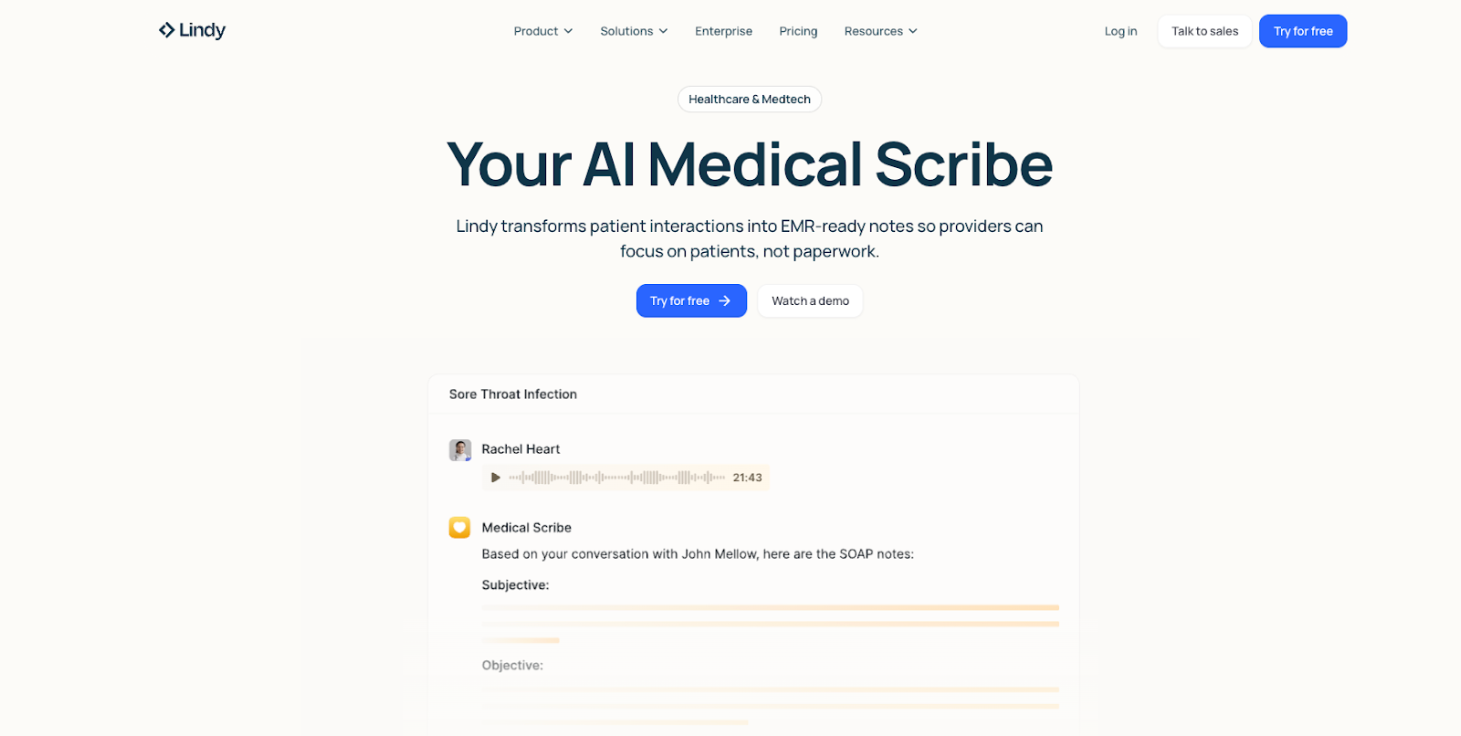 What it does: Lindy is an AI assistant you can text to turn conversations or dictation into structured SOAP notes, follow-up tasks, and patient messages. It handles the work that usually happens after the visit, so you spend less time on charting and admin.
