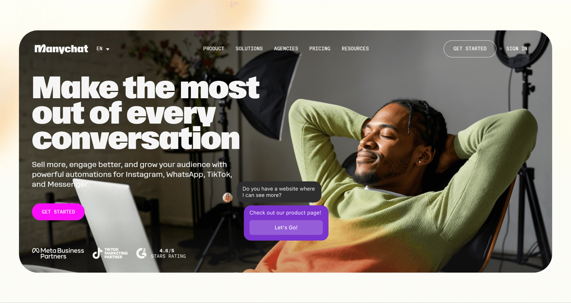 - Manychat, if you rely on Instagram or WhatsApp for top-of-funnel traffic and want automated DMs and lead capture