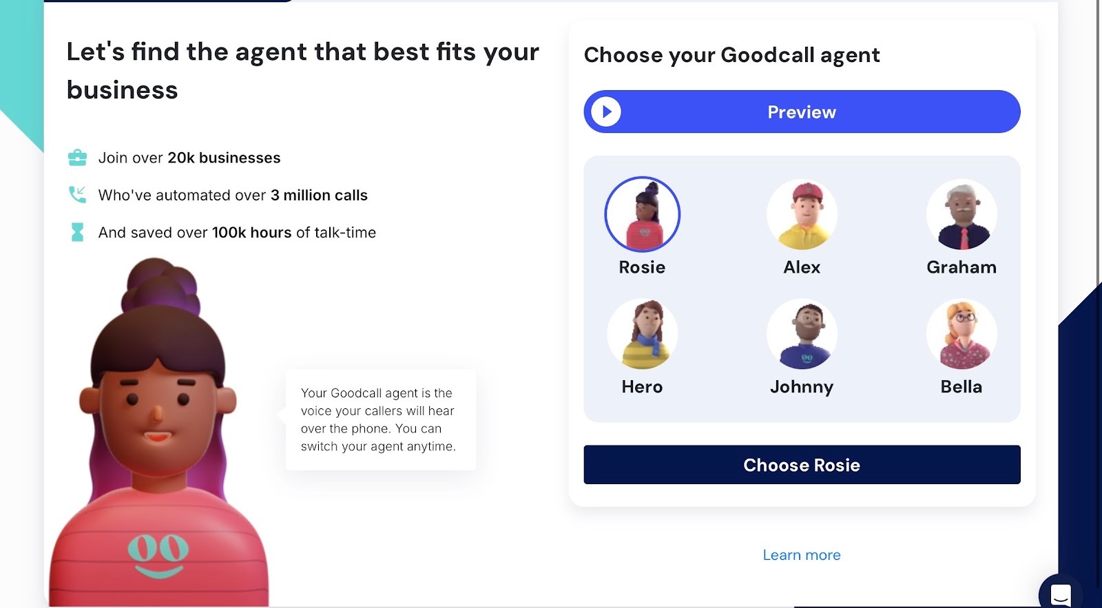 What it is: Goodcall is a no-code voice agent that answers customer calls, books appointments, and handles common questions without requiring technical setup.