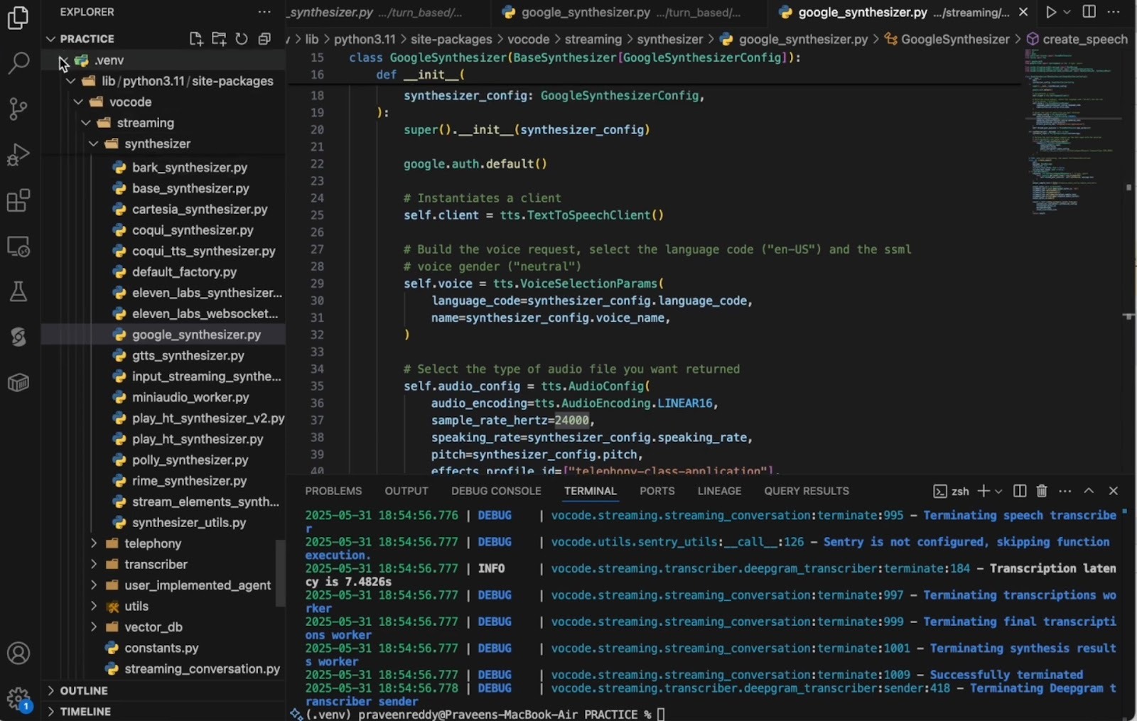 In Vocode, you build the voice agent directly in your own codebase rather than configure it through a preset interface. You start from the open-source core, choose your ASR, TTS, and LLM components, and wire them together through the Python or Node SDK to create a custom pipeline.