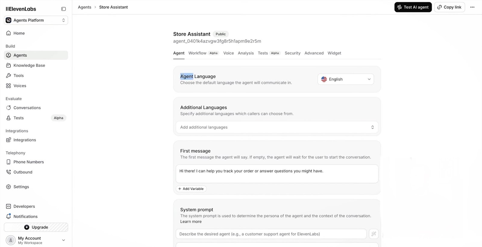 ElevenLabs approaches voice work from the creative side first. You begin by shaping how the voice should sound: clear, energetic, calm, or conversational, so the agent already feels intentional before you ever design its behavior.